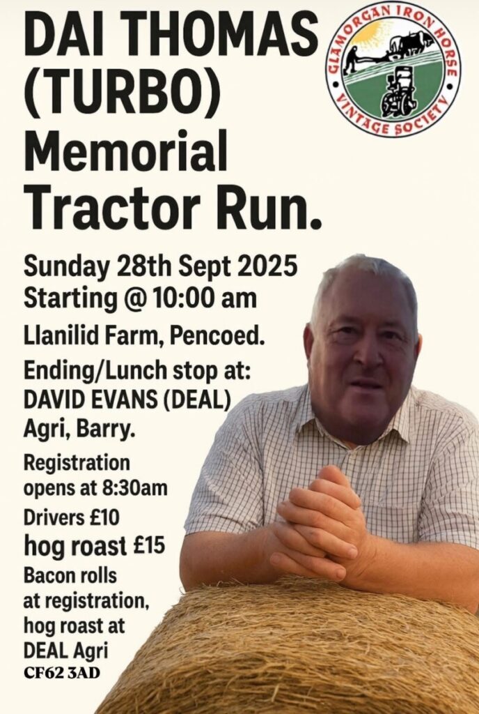 One of these events is the Dai Thomas (Turbo) Memorial Tractor Run, taking place on Sunday 28th September 2025. The run will start from Llanilid Farm, Pencoed CF35 5LA at 10:00am (registration from 8:30am), before finishing at David Evans (DEAL) Agri, Barry, where a hog roast will be served.